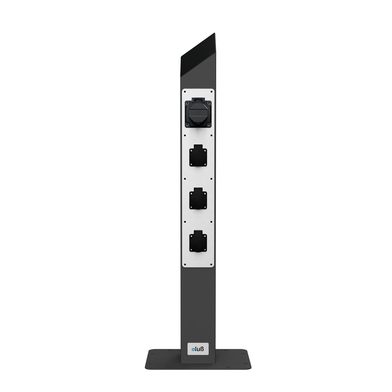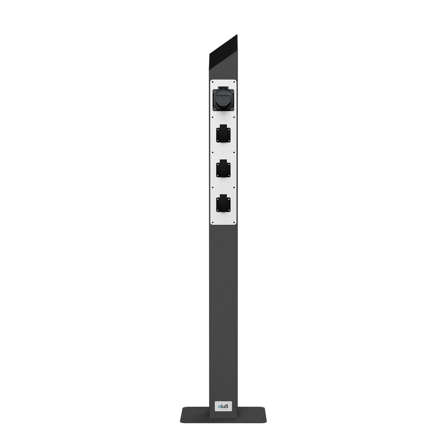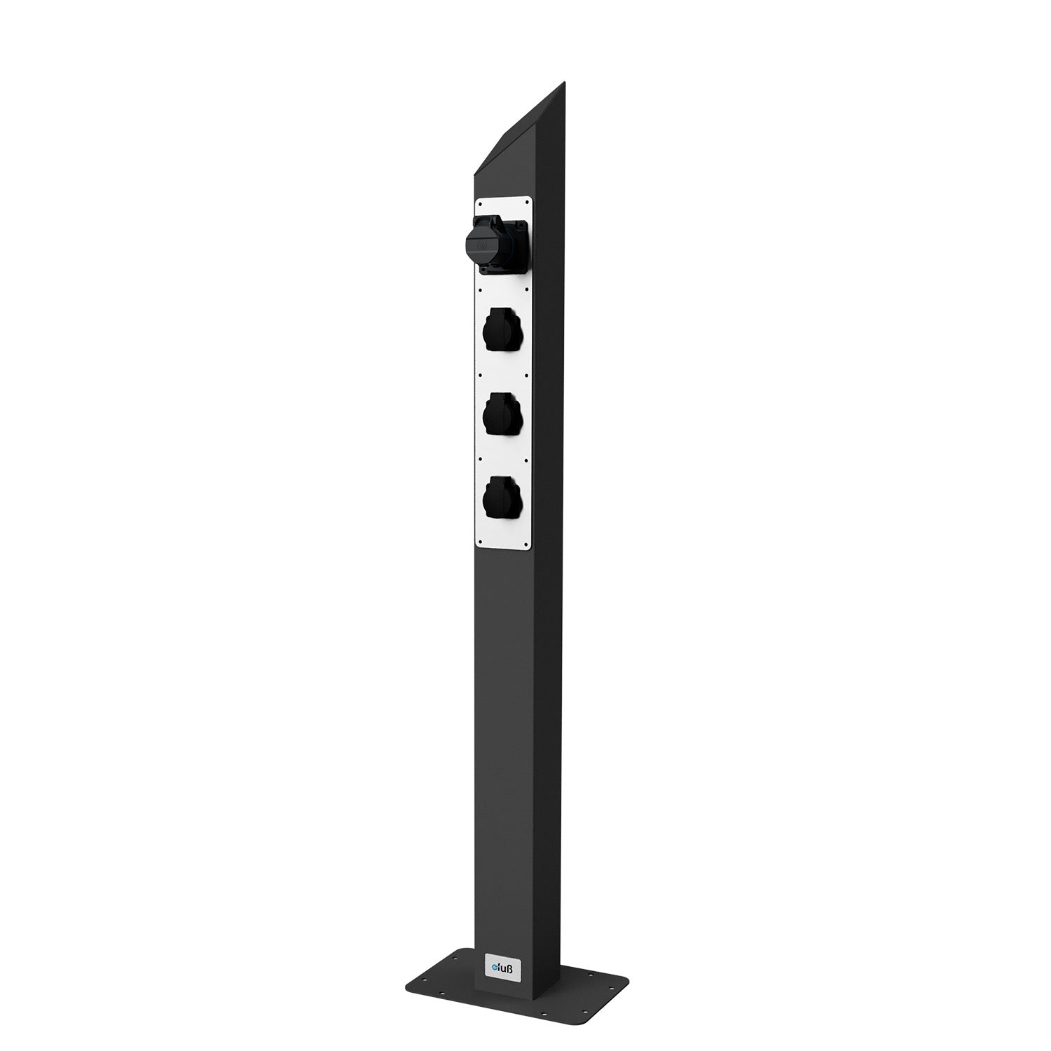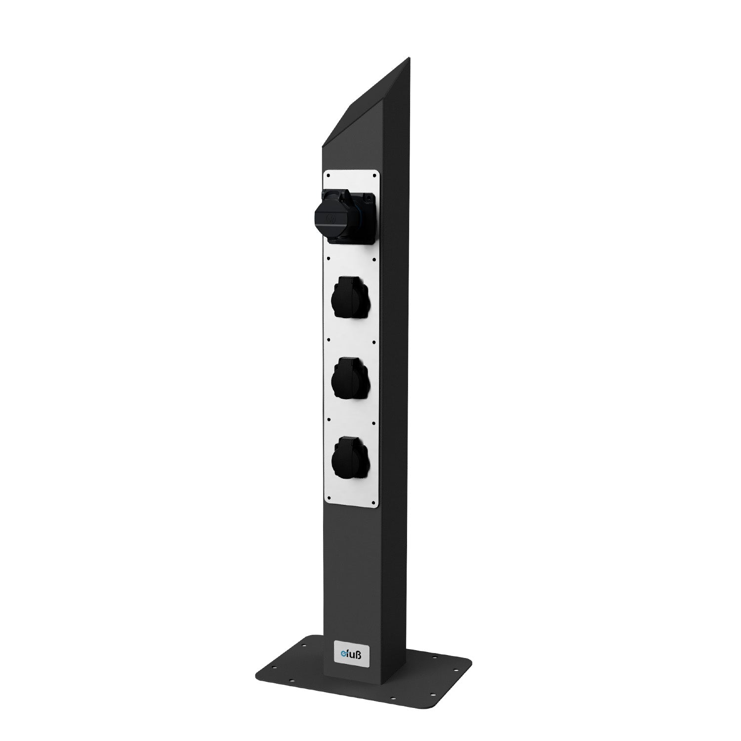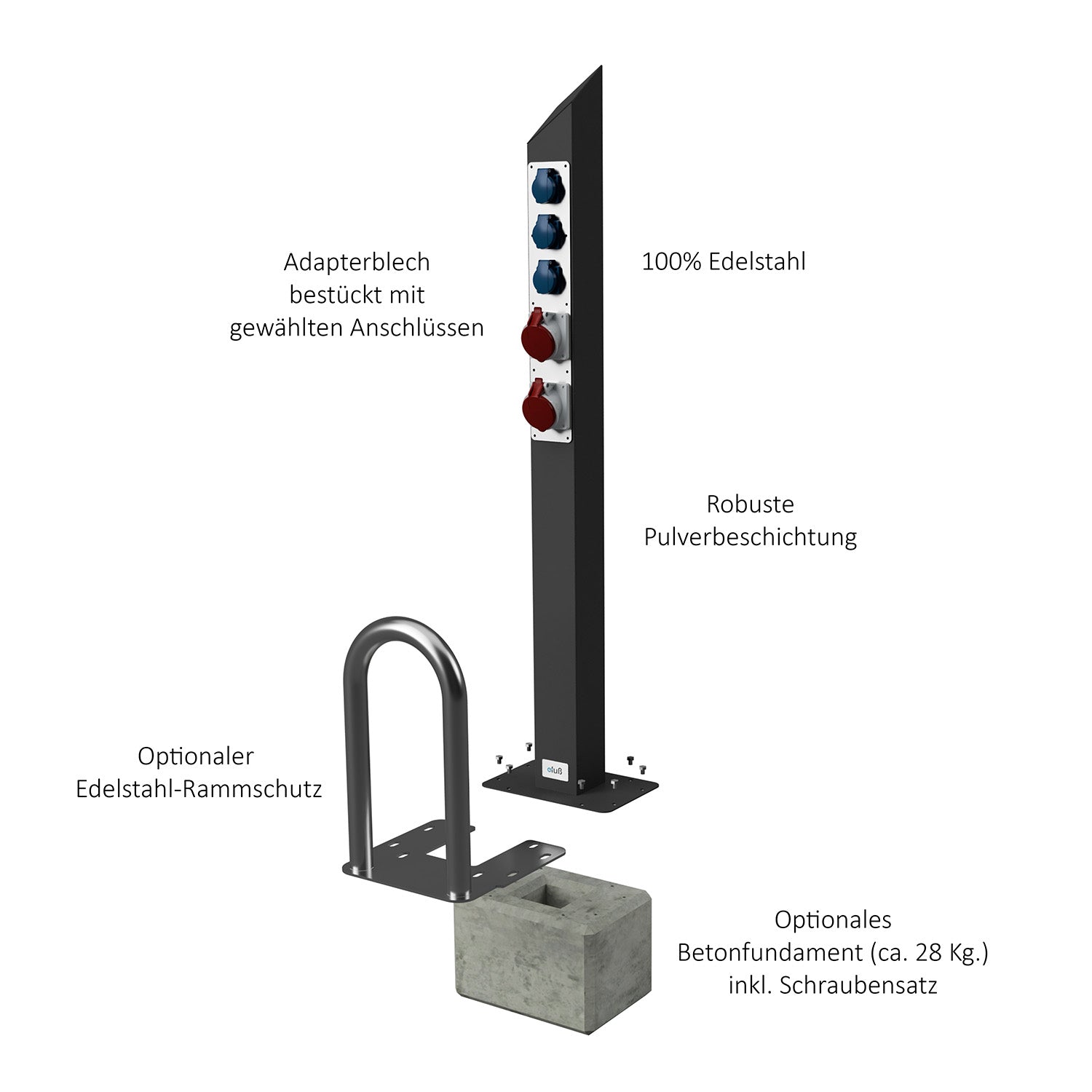 Die hochwertige Säule für Campingplatz, Marina oder Gartenanlage auf Basis unseres bewährten Edelstahl-Standfußes – ausgestattet mit einem frontseitig integrierten Steckdosenpanel mit 3 Schuko-Steckdosen (230 V) und 1x CEE 16A, 3-polig (blau, 6h) für den ortsfesten Einsatz im Innen- und Außenbereich.