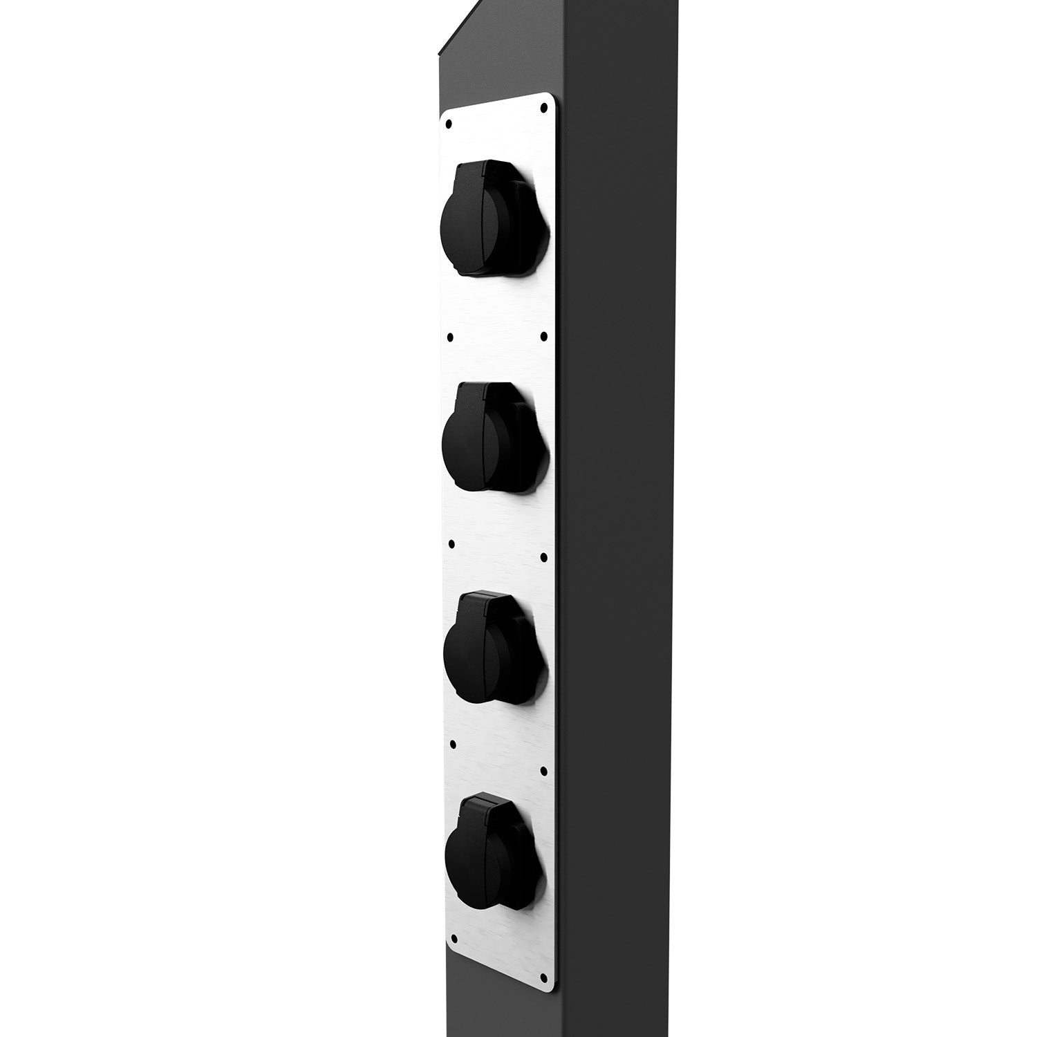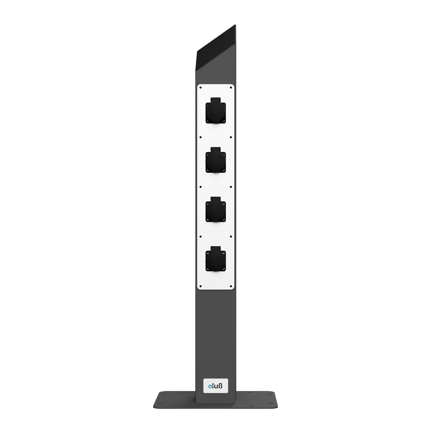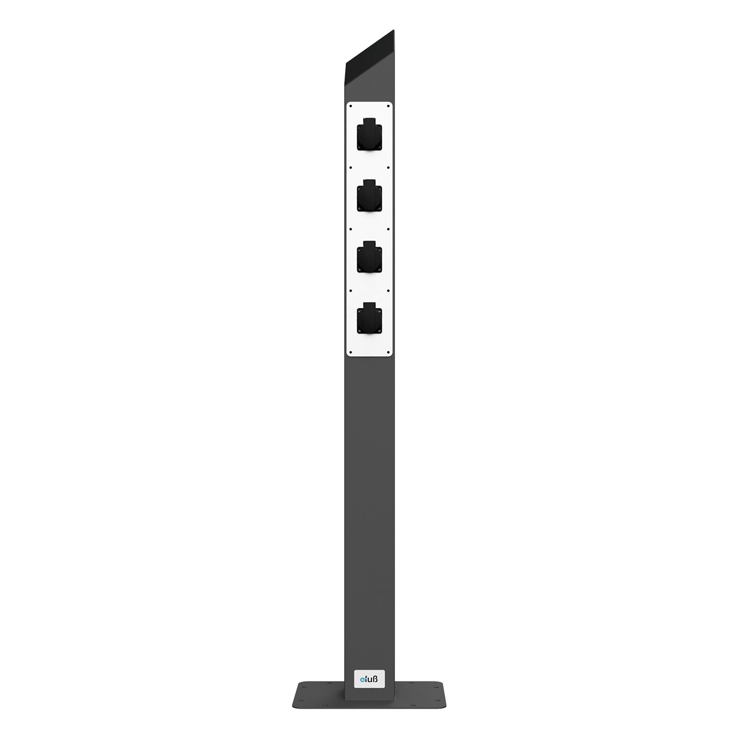 Die hochwertige Energiesäule auf Basis unseres bewährten Standfußes, ausgestattet mit einem frontseitig integrierten Steckdosenpanel mit 4× Schuko-Steckdosen (230 V) für den ortsfesten Einsatz im Innen- und Außenbereich.